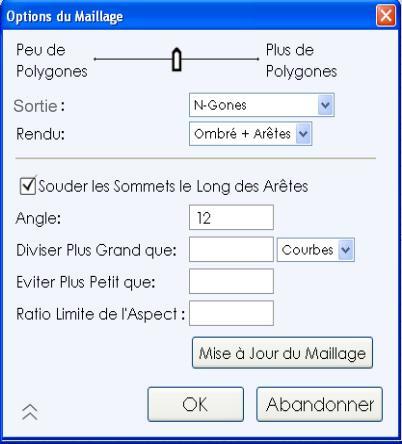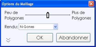 La boîte de dialogue ''Options du Maillage'' est montrée durant ce processus pour contrôler différents aspects dont la façon dont les données des polygones sont générées.