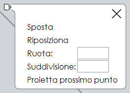 L'opzione "Ruota" dispone di un riquadro di input, che permette di ruotare la linea di costruzione di un determinato angolo, introdotto via tastiera, rispetto al suo punto base.